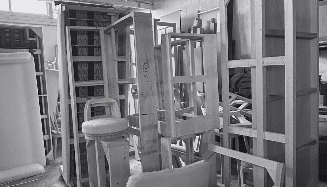 Por otro lado, Marco trabaja en la construcción de un mueble nuevo, uno de nuestros clásicos: el sofá Sophia XXL. Este imponente sofá curvo se compone de tres módulos, cada uno trabajado por separado para asegurar un acabado perfecto en cada detalle. En esta ocasión, Marco está tensando las cintas elásticas que sirven de soporte en la base del mueble, asegurando la firmeza necesaria para soportar peso y proporcionar la comodidad que caracteriza a nuestros productos. Todo el proceso se realiza a mano, con materiales cuidadosamente seleccionados, sin recurrir a herramientas industriales.