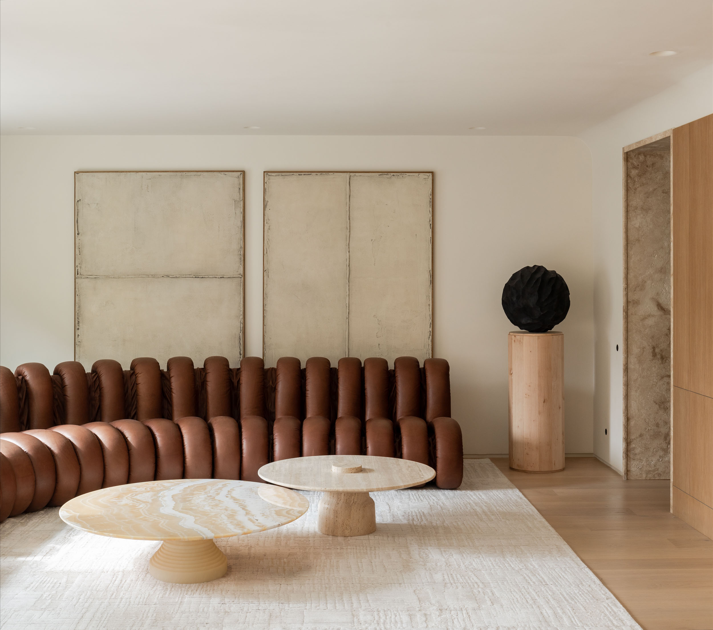 Los arquitectos de La Villa Studio enfatizan que cada pieza de mobiliario fue elegida con meticulosa atención al detalle. Optaron por el sofá modular Tina de Studio Bañón, una pieza dramática que contrasta con los ángulos del espacio. Este sofá se complementa con obras de Antonia Ferrer, que armonizan perfectamente gracias a sus tonos blancos y grises, y se suma a una escultura circular realizada por Tanadori Yamaguchi.