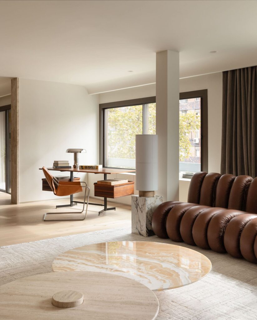 La Villa Studio comparte en este artículo su principal objetivo: devolver vida y luminosidad a este espacio. El equipo de arquitectos lo logró al diseñar un pasillo que permite que la luz fluya desde las ventanas hasta el salón principal. Con una paleta de colores dominada por tonos marrones y neutros, los materiales destacados incluyen roble y piedra natural. Estos colores neutros proporcionan un lienzo perfecto para las obras de arte cuidadosamente seleccionadas.